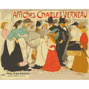 This delightful scene captures a lively crowd admiring street posters in true turn-of-the-century style—with parasols, polka dots, and plenty of personality. From dapper gentlemen tipping their top hats to curious kiddos in red polka-dotted frocks, this Parisian moment is practically begging for a splash of color.